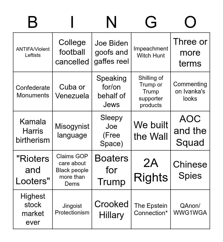This bingo card has a free space and 54 words: Washington Football name change, "Rioters and Looters", Democratic Mayors and Governors, Sturgiss, Boaters for Trump, "China Flu"/"Chinese Virus", Impeachment Witch Hunt, Vote by Mail Fraud, Confederate Monuments, Mt. Rushmore, ANTIFA/Violent Leftists, "Back the Blue", Jingoist Protectionism, Highest stock market ever, Politicizing the virus, Crooked Hillary, QAnon/ WWG1WGA, Shilling of Trump or Trump supporter products, Cancel culture, AOC and the Squad, 2A Rights, Fake News, We built the Wall, Three or more terms, Red Baiting, College football cancelled, California Wildfires, "Russia Hoax"/Mueller Report, Roger Stone speaking appearance, The Epstein Connection*, Mask mandates and "freedom", Ted Nuggent music appearance, NASCAR, Racial dog whistles: "animals", "savages" or "thugs", Joe Biden goofs and gaffes reel, TikTok, Kamala Harris birtherism, Chinese Spies, Hydroxychloroquine, Cuba or Venezuela, Something startlingly close to the 14 words, Praise for Putin, Claiming we've handled the virus better than any other country, Pocahontas, Claims GOP care about Black people more than Dems, Hunter Biden, Alice Johnson and Prison Reform, Kanye West appearance, Speaking for/on behalf of Jews, Misogynist language, Commenting on Ivanka's looks, Insinuations Kamala slept her way to a career, MLK was a Republican and Bathroom Sickos.
