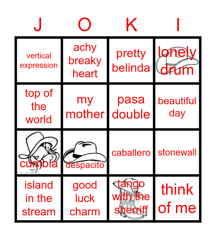 This bingo card has 4 images and 16 words: island in the stream, good luck charm, pretty belinda, lonely drum, top of the world, achy breaky heart, caballero, stonewall, vertical expression, my mother, tango with the sherriff, beautiful day, cumbia, despacito, pasa double and think of me.
