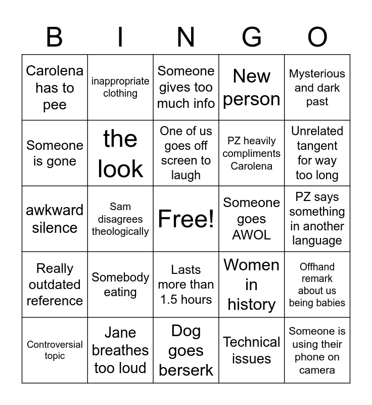 This bingo card has a free space and 30 words: Jane breathes too loud, kid bouncing on the couch, Sam disagrees theologically, Collin Wildcard, Carolena has to pee, Someone gives too much info, the look, Lasts more than 1.5 hours, Someone goes AWOL, Dog goes berserk, PZ says something in another language, Someone is using their phone on camera, Technical issues, Icebreaker :3, Unrelated tangent for way too long, Collin Wildcard, Women in history, Really outdated reference, Somebody eating, Mysterious and dark past, awkward silence, Jean's husband way off in corner, inappropriate clothing, PZ heavily compliments Carolena, Someone is gone, New person, Offhand remark about us being babies, Controversial topic, One of us goes off screen to laugh and Mic was on/off.