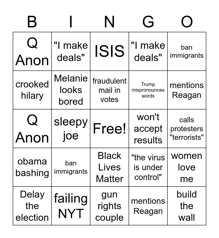 This bingo card has a free space and 59 words: nasty, failing NYT, fabulous, obama bashing, mentions Reagan, black guy in the audience, Melanie looks bored, MAGA hat, Trump mispronounces words, lame celebrity, "I make deals", "the best ever...", crooked hilary, sleepy joe, muslim bashing, Q Anon, build the wall, ban immigrants, calls protestors "terrorists", fraudulent mail in votes, won't accept results, ISIS, Delay the election, women love me, nasty, failing NYT, fabulous, obama bashing, mentions Reagan, black guy in the audience, Melanie looks bored, MAGA hat, Trump mispronounces words, lame celebrity, "I make deals", "the best ever...", crooked hilary, sleepy joe, muslim bashing, Q Anon, build the wall, ban immigrants, calls protesters "terrorists", fraudulent mail in votes, won't accept results, praises Ivanka, Baron sighting, "Listen...", Black Lives Matter, gun rights couple, fake news, bad Covid cures, "Radical Dems", "disgraceful", kisses flag, "the virus is under control", "Look...", smug face and clap & point.