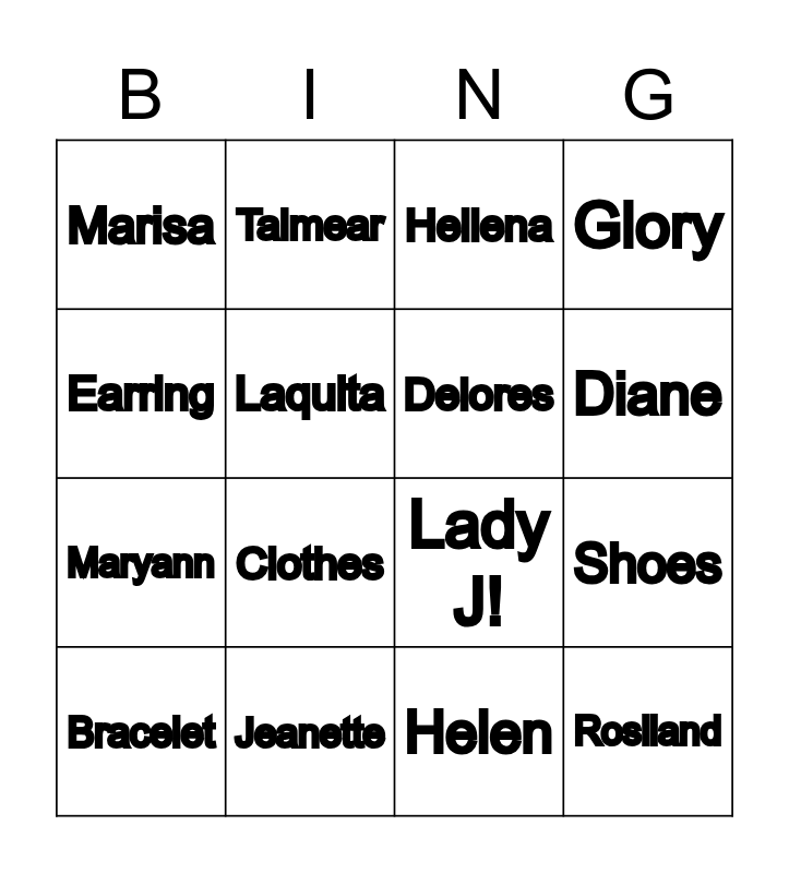 This bingo card has 21 words: Jeanette, Cynthia, Talmear, Tracey, Helen, Delores, Marisa, Hellena, Lady J!, Diane, Maryann, Glory, Rosiland, Lisa, Laquita, Sherrie, Bracelet, Clothes, Earring, Shoes and Neckalace.