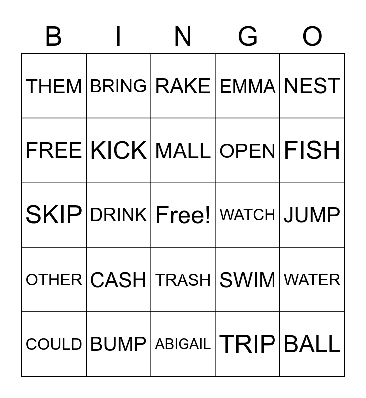 This bingo card has a free space and 24 words: CASH, BUMP, MALL, COULD, NEST, THEM, FREE, BRING, WATCH, TRASH, OPEN, SKIP, SWIM, WATER, KICK, TRIP, JUMP, RAKE, FISH, DRINK, BALL, OTHER, EMMA and ABIGAIL.