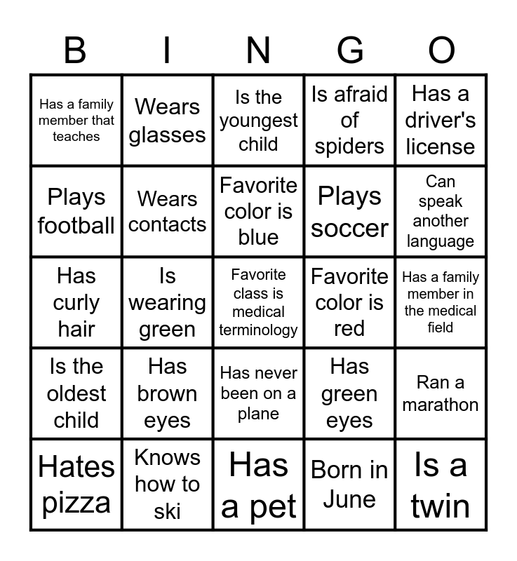 This bingo card has a free space and 34 words: Born in August, Born in June, Is an only child, Has traveled out of the country, Is the oldest child, Wears contacts, Has a driver's license, Hates pizza, Wears glasses, Enjoys fishing, Favorite color is blue, Is the youngest child, Enjoys reading books, Favorite food is cereal, Favorite color is red, Can speak another language, Knows how to ski, Has curly hair, Has brown eyes, Has green eyes, Has never been on a plane, Can play a musical instrument, Has a family member that teaches, Has a family member in the medical field, Has a pet, Is a twin, Is afraid of spiders, Is allergic to peanuts, Plays soccer, Plays football, Is wearing purple, Is wearing green, Ran a marathon and Has braces.
