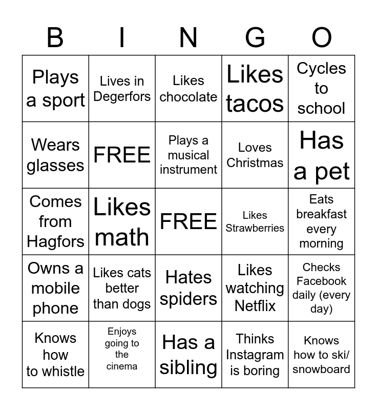 This bingo card has a free space and 24 words: Likes cats better than dogs, Enjoys going to the cinema, Plays a musical instrument, Knows how to whistle, Cycles to school, Plays a sport, Wears glasses, Lives in Degerfors, Likes Strawberries, Hates spiders, Loves Christmas, Comes from Hagfors, Likes watching Netflix, Checks Facebook daily (every day), FREE, Thinks Instagram is boring, Eats breakfast every morning, Likes chocolate, Has a pet, Likes math, Knows how to ski/ snowboard, Owns a mobile phone, Likes tacos and Has a sibling.