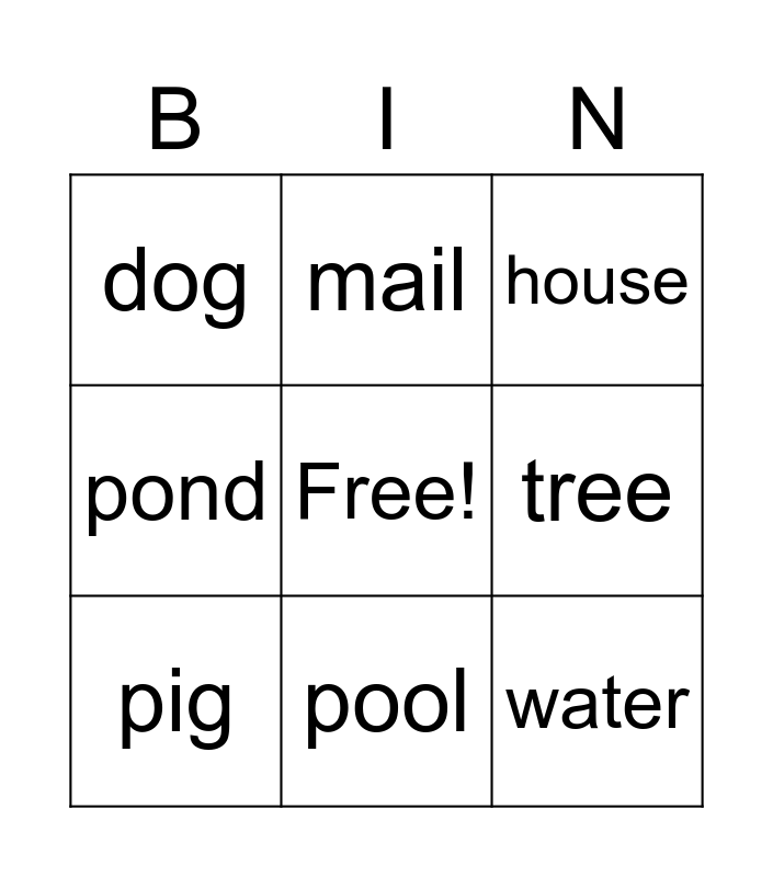 This bingo card has a free space and 8 words: tree, house, mail, pig, dog, water, pond and pool.