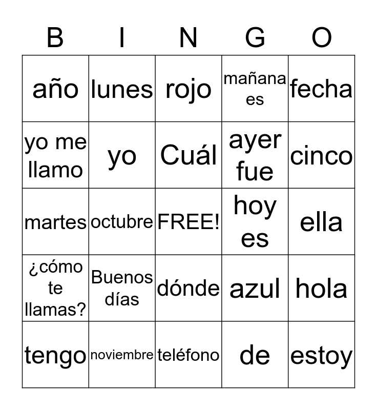 This bingo card has a free space and 24 words: Buenos días, noviembre, Cuál, tengo, fecha, año, yo me llamo, lunes, hoy es, dónde, ayer fue, martes, azul, hola, yo, de, ella, rojo, cinco, octubre, estoy, ¿cómo te llamas?, mañana es and teléfono.