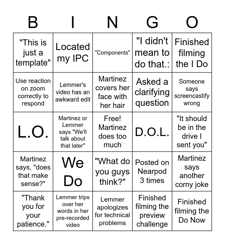 This bingo card has a free space and 44 words: "Lesson plan", Finished filming the Do Now, Lemmer or Martinez drop something, "Thank you for your patience.", Equity, Finished filming the preview challenge, "Components", located my YAG, Finished filming the I Do, Lemmer trips over her words in her pre-recorded video, "I didn't mean to do that.:, D.O.L., "What do you guys think?", We Do, Volunteered to be first during the role play, Lemmer apologizes for technical problems, Finished filming the L.O/Vocab, L.O., "Manipulatives", Someone says screencastify wrong, Located my IPC, Located my lesson plans, "Bear with me", "This is just a template", "Are there any questions", "It should be in the drive I sent you", Pushed yourself out of your comfort zone, "One-pager", Posted on Nearpod 3 times, Martinez says, "does that make sense?", Martinez talks too fast, Martinez says another corny joke, Martinez or Lemmer says "or whatever", Martinez or Lemmer overwhelm you again but promise to support you, Martinez or Lemmer says "We'll talk about that later", Martinez laughs at her own joke, Martinez makes a note she can't read, Lemmer's face turns bright red, Martinez covers her face with her hair, Use reaction on zoom correctly to respond, Asked a clarifying question, Kept an open mind the entire day, Lemmer's video has an awkward edit and Lemmer or Martinez can't figure out how to do something on zoom..
