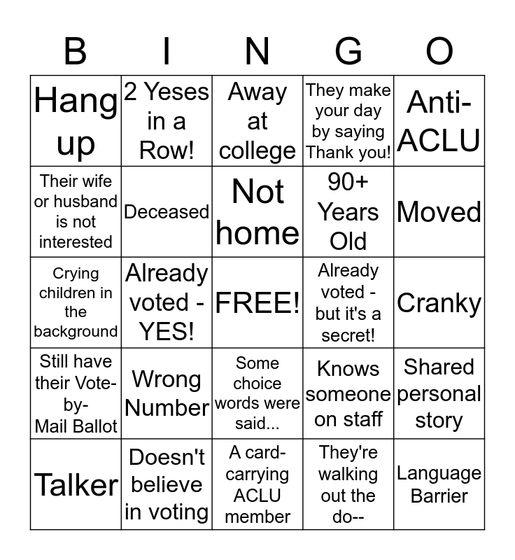 This bingo card has a free space and 24 words: Wrong Number, Doesn't believe in voting, Not home, Talker, Anti- ACLU, Hang up, Their wife or husband is not interested, 2 Yeses in a Row!, Already voted - but it's a secret!, Some choice words were said..., 90+ Years Old, Crying children in the background, Knows someone on staff, Shared personal story, Deceased, They're walking out the do--, Cranky, Away at college, Moved, Already voted - YES!, Language Barrier, Still have their Vote-by- Mail Ballot, They make your day by saying Thank you! and A card- carrying ACLU member.