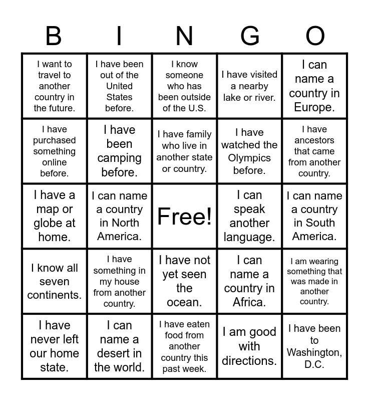 This bingo card has a free space and 28 words: I am wearing something that was made in another country., I can name the capital of Illinois., I have watched the Olympics before., I am good with directions., I have purchased something online before., I know someone who has been outside of the U.S., I have been out of the United States before., I know all seven continents., I can speak another language., I have never left our home state., I have a map or globe at home., I have visited a nearby lake or river., I can name a desert in the world., I have eaten food from another country this past week., I have ancestors that came from another country., I can describe the flag of another country besides the U.S., I have something in my house from another country., I have been camping before., I have family who live in another state or country., I have not yet seen the ocean., I want to travel to another country in the future., I can name all fifty states., I have been to Washington, D.C., I can name a country in North America., I can name a country in South America., I can name a country in Africa., I can name a country in Europe. and I can name a country in Asia.