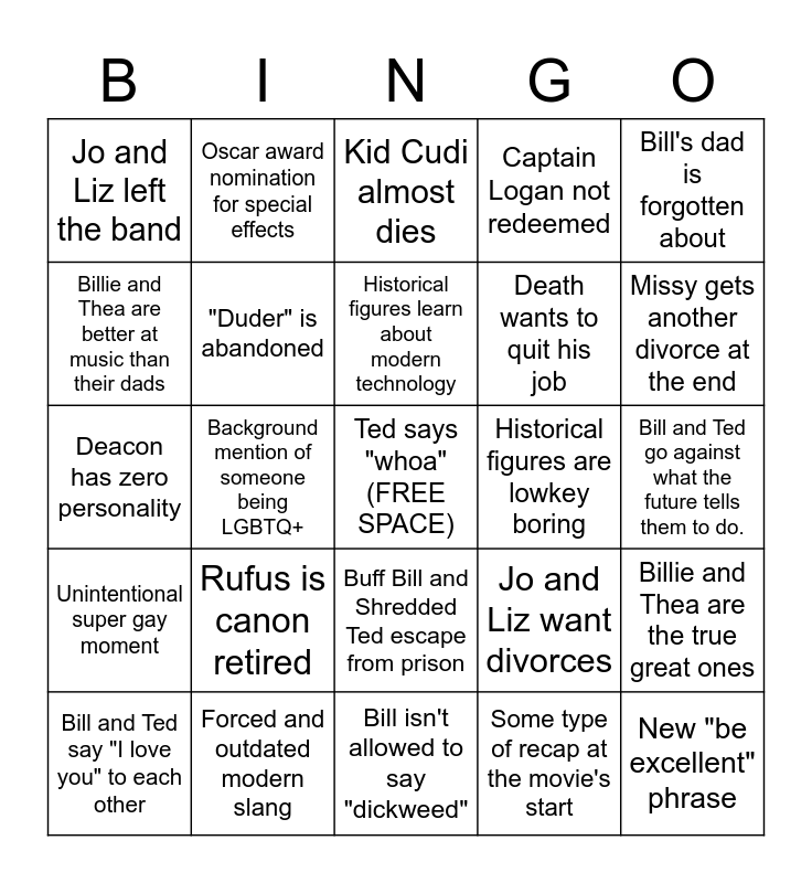 This bingo card has a free space and 24 words: Rufus is canon retired, Forced and outdated modern slang, Historical figures learn about modern technology, Bill and Ted say "I love you" to each other, Bill's dad is forgotten about, Jo and Liz left the band, Billie and Thea are better at music than their dads, Oscar award nomination for special effects, Historical figures are lowkey boring, Buff Bill and Shredded Ted escape from prison, Death wants to quit his job, Deacon has zero personality, Jo and Liz want divorces, Billie and Thea are the true great ones, "Duder" is abandoned, Some type of recap at the movie's start, Bill and Ted go against what the future tells them to do., Kid Cudi almost dies, Missy gets another divorce at the end, Background mention of someone being LGBTQ+, New "be excellent" phrase, Unintentional super gay moment, Captain Logan not redeemed and Bill isn't allowed to say "dickweed".