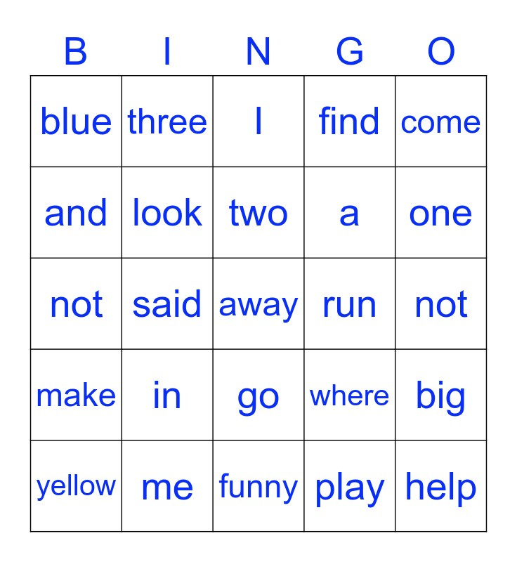 This bingo card has 30 words: yellow, you, two, red, come, blue, three, go, run, help, make, look, win, play, big, little, said, away, where, one, not, me, I, a, not, and, in, funny, find and here.