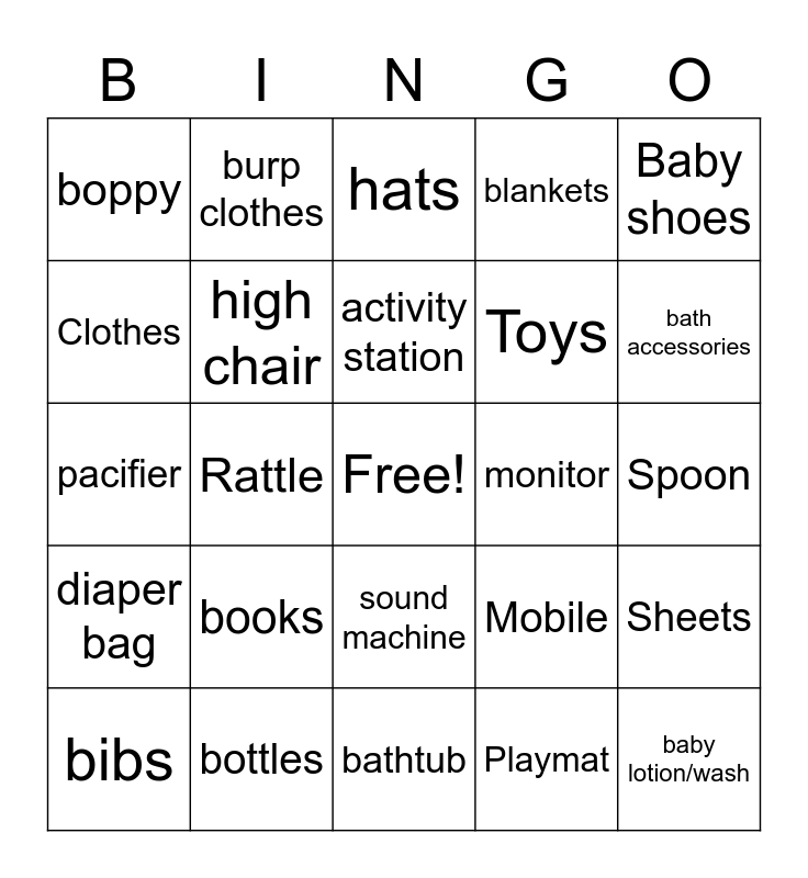 This bingo card has a free space and 28 words: Sheets, Snot sucker, Toys, Playmat, Clothes, hats, burp clothes, diaper bag, monitor, bibs, pacifier, blankets, bottles, bathtub, bath accessories, mommy hooks, books, high chair, activity station, sound machine, boppy, socks, baby lotion/wash, Rattle, Spoon, Mobile, Baby shoes and Bottle warmer.