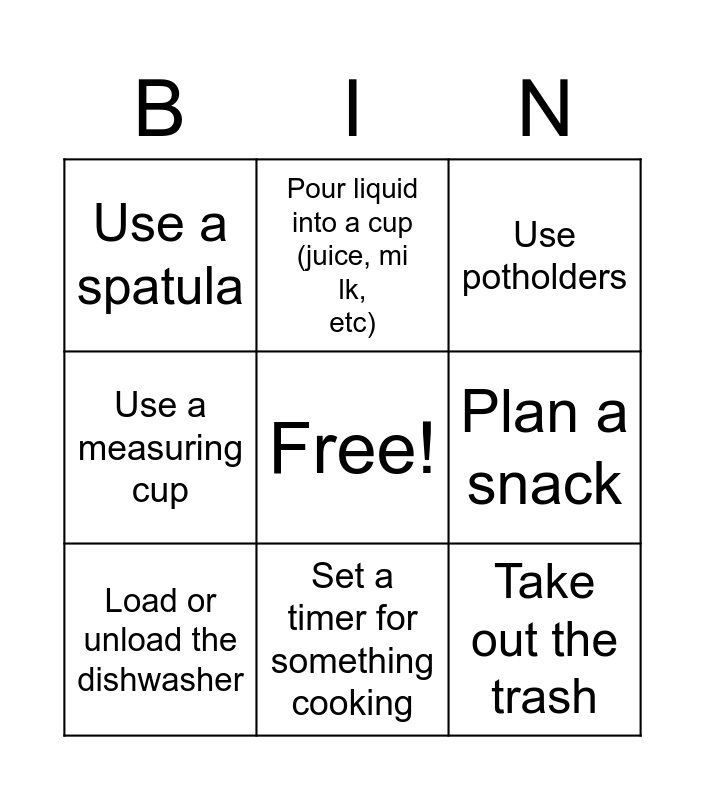This bingo card has a free space and 8 words: Plan a snack, Use potholders, Pour liquid into a cup (juice, milk, etc), Load or unload the dishwasher, Use a spatula, Take out the trash, Use a measuring cup and Set a timer for something cooking.