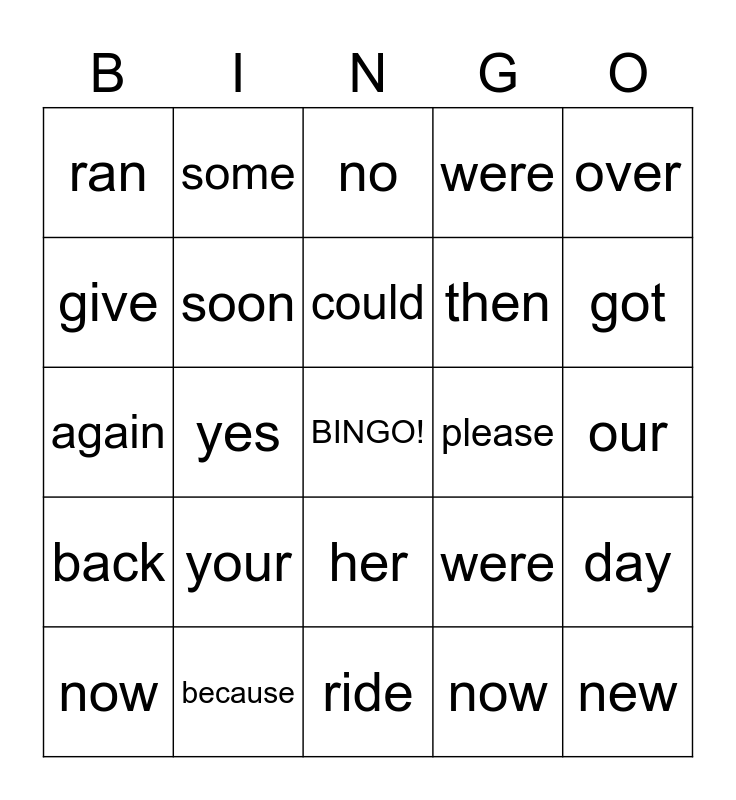 This bingo card has a free space and 31 words: ride, under, yes, well, ran, no, soon, were, please, now, our, new, must, pretty, got, looking, day, your, back, her, over, next, now, some, then, give, were, again, because, could and does.