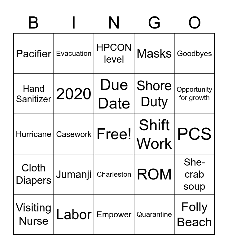 This bingo card has a free space and 28 words: She-crab soup, Folly Beach, Shore Duty, Quarantine, Hand Sanitizer, HPCON level, Evacuation, Cloth Diapers, Shift Work, Visiting Nurse, Hurricane, Masks, Labor, Empower, Opportunity for growth, Covid-19, Jumanji, 2020, Due Date, Charleston, Pacifier, Sleep through the night, Folly Beach, Casework, PCS, ROM, Goodbyes and Murder Hornets.