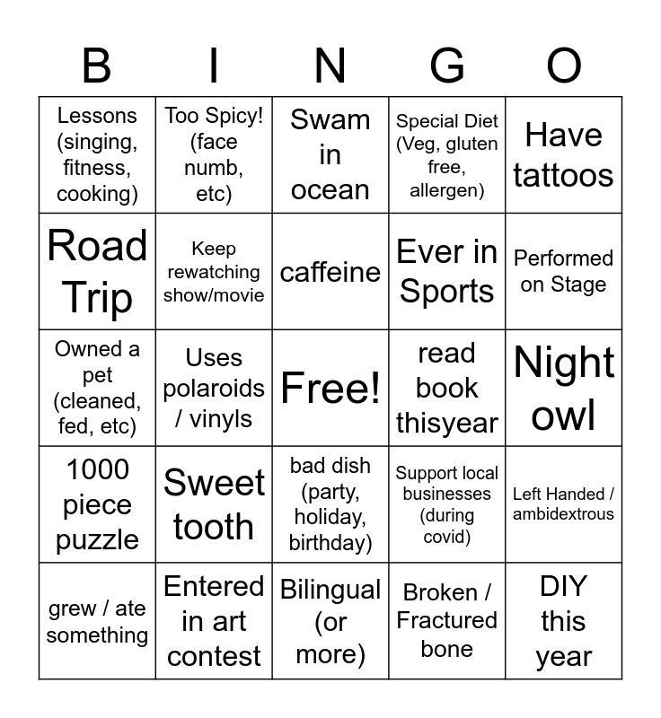 This bingo card has a free space and 28 words: Left Handed / ambidextrous, Was ever a superhero for Halloween, Ever in Sports, Broken / Fractured bone, Road Trip, Swam in ocean, Too Spicy! (face numb, etc), 1000 piece puzzle, read book thisyear, grew / ate something, Owned a pet (cleaned, fed, etc), Special Diet (Veg, gluten free, allergen), Entered in art contest, Bilingual (or more), Performed on Stage, Drive in theater, Sweet tooth, Keep rewatching show/movie, caffeine, bad dish (party, holiday, birthday), Lessons (singing, fitness, cooking), Glasses, contacts, lasik, DIY this year, Uses polaroids / vinyls, Night owl, Support local businesses (during covid), Have tattoos and Traded (better value?).