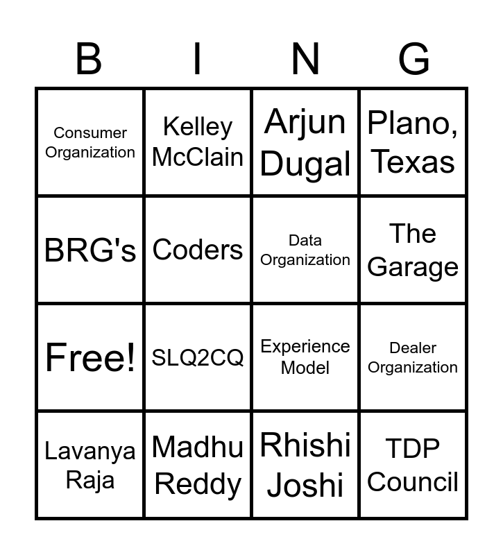 This bingo card has 20 words: Lavanya Raja, FS Tech & Data, Arjun Dugal, Dealer Organization, Refi Organization, SLQ2CQ, Rhishi Joshi, Plano, Texas, Free!, Kelley McClain, Experience Model, The Garage, Consumer Organization, Madhu Reddy, Data Organization, Deliver with Heart, BRG's, Coders, Campus Recruiting and TDP Council.