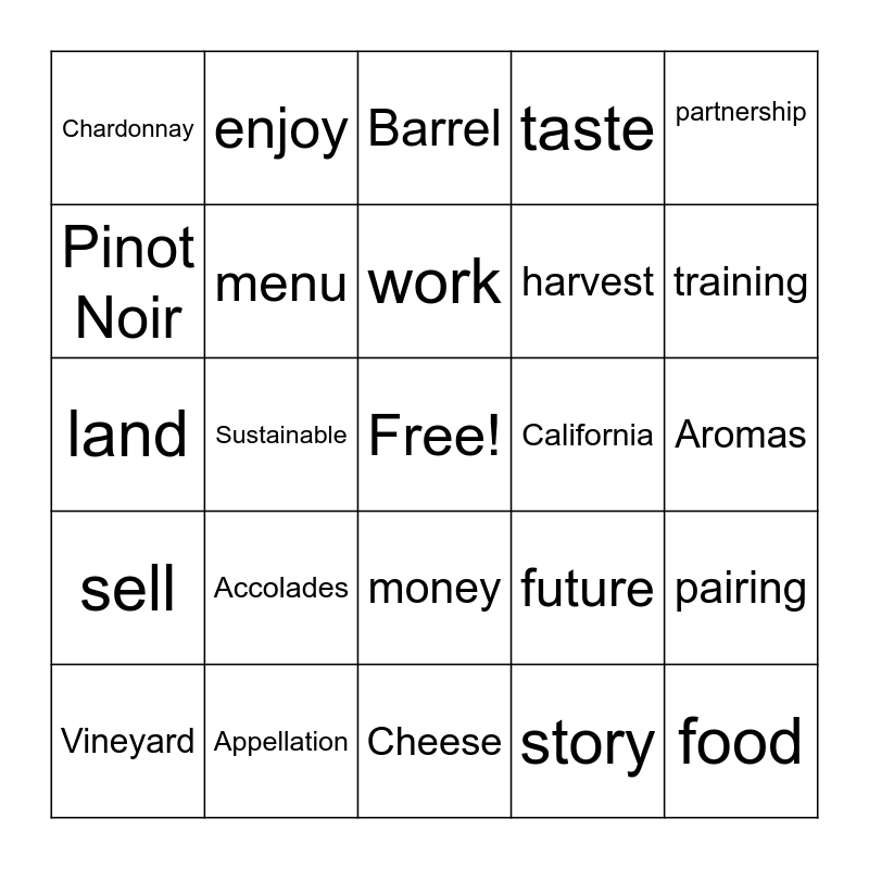 This bingo card has a free space and 29 words: Vineyard, Profit, Sustainable, Family, Chardonnay, Barrel, menu, Accolades, California, Appellation, Aromas, food, Cheese, story, training, education, money, sell, partnership, land, future, grapes, harvest, Pinot Noir, taste, enjoy, pairing, work and scores.