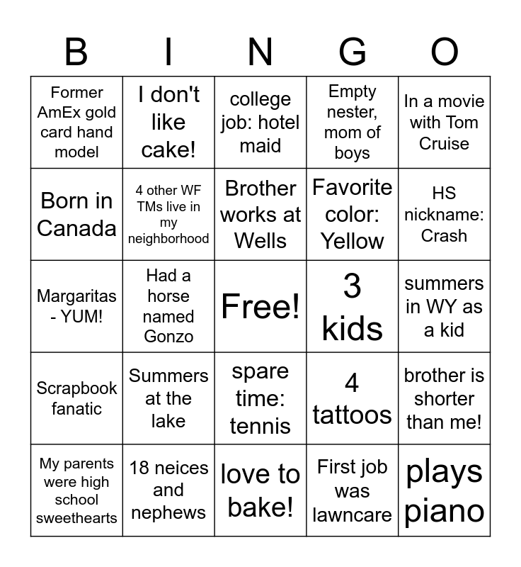 This bingo card has a free space and 24 words: Summers at the lake, 18 neices and nephews, Brother works at Wells, My parents were high school sweethearts, In a movie with Tom Cruise, Former AmEx gold card hand model, Born in Canada, I don't like cake!, 3 kids, spare time: tennis, Favorite color: Yellow, Margaritas - YUM!, 4 tattoos, brother is shorter than me!, 4 other WF TMs live in my neighborhood, First job was lawncare, summers in WY as a kid, college job: hotel maid, HS nickname: Crash, Had a horse named Gonzo, plays piano, Scrapbook fanatic, Empty nester, mom of boys and love to bake!.