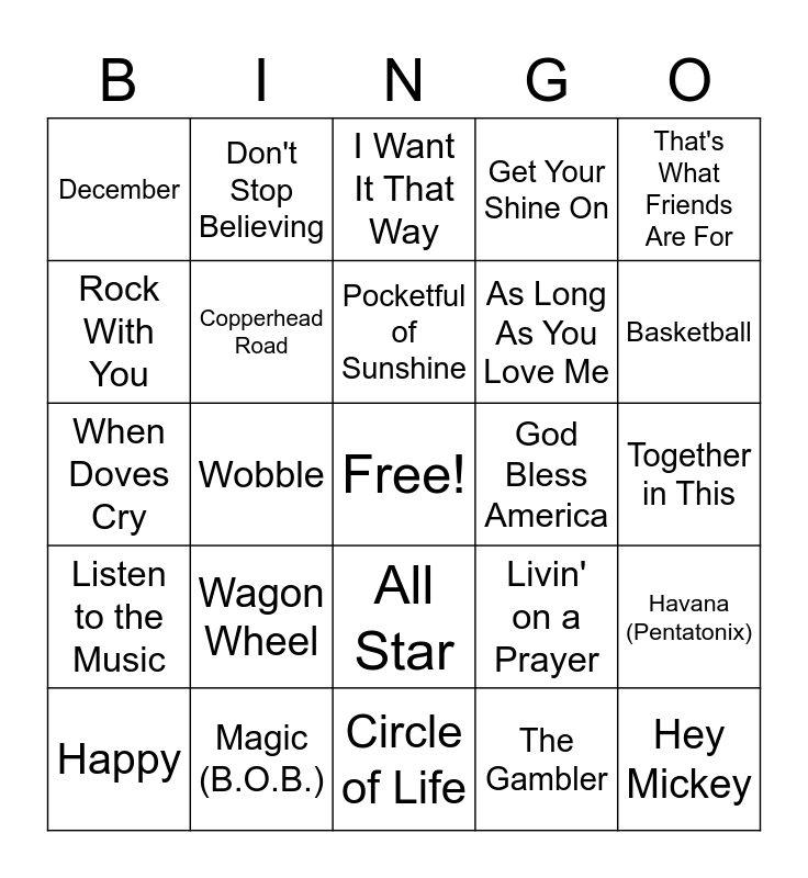 This bingo card has a free space and 30 words: Magic (B.O.B.), Baby Shark, Wobble, Jailhouse Rock, December, I Want It That Way, Copperhead Road, All Star, God Bless America, Circle of Life, Together in This, Hey Mickey, The Gambler, Single Ladies, Basketball, I Found My Place (Ninjago), Livin' on a Prayer, Listen to the Music, Wagon Wheel, That's What Friends Are For, When Doves Cry, My Girl, Don't Stop Believing, As Long As You Love Me, Rock With You, Get Your Shine On, Havana (Pentatonix), Happy, Pocketful of Sunshine and Let it Go.