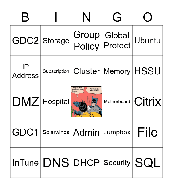This bingo card has a free space and 90 words: 3Par, Active Directory, Admin, Anti-virus, ApexOne, Apps, Azure, Battery Cache, Blade, Bomgar, CAB, Certificate, Chassis, Citrix, Clinic, Cluster, Commvault, Corporate, CPU, Data Center, Deep Security, Desktop, DHCP, Disk, DMZ, DNS, Domain, Epsom, ESXi, EUC, F&W, File, Folder, GDC1, GDC2, Global Protect, Group Policy, Horizon, Hospital, HSSU, InTune, IP Address, iPod, Ivanti, JIRA, Jumpbox, Keyboard, LAPS, Laptop, License, Linux, Memory, MFA, Microsoft, MIM, Mobile, Motherboard, Mouse, Nightingale, O365, Office, OS, Password, Patches, Printer, Resource Groups, SCCM, Security, Server, Skype, Solarwinds, SQL, SSD, SSL, Storage, Subscription, Tangible, Teams, Template, Terminal, Trend, Ubuntu, UPS, VMWare, VPN, vSphere, Vulnerability, Windows, WSUS and XA Account.