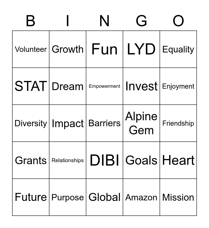 This bingo card has 35 words: Soroptimist, Projects, Women, Dream, DIBI, LYD, STAT, Scholarships, Empowerment, Education, Diversity, Equality, Soroptimist (Free), Fellowship, Volunteer, Alpine Gem, Amazon, Impact, Grants, Barriers, Goals, Future, Heart, Purpose, Fun, Enjoyment, Mission, Fundraisers, Invest, Friendship, Mentors, Global, Relationships, Growth and Exponential.