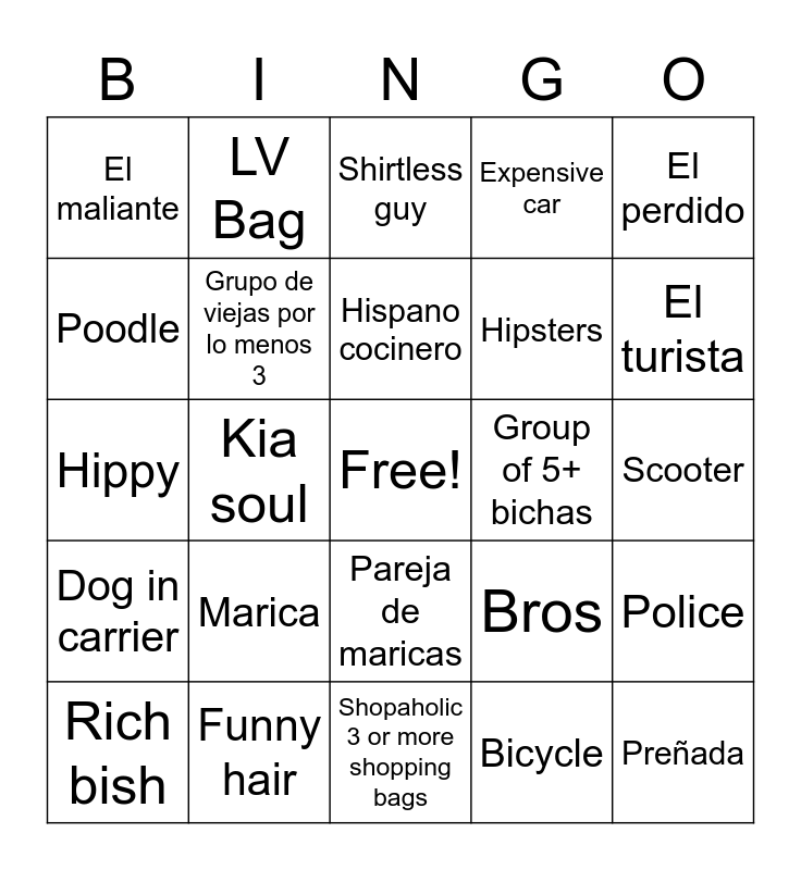 This bingo card has a free space and 24 words: Marica, Funny hair, Hispano cocinero, Rich bish, El perdido, El maliante, Poodle, LV Bag, Group of 5+ bichas, Pareja de maricas, Hipsters, Hippy, Bros, Police, Grupo de viejas por lo menos 3, Bicycle, Scooter, Shirtless guy, El turista, Kia soul, Preñada, Dog in carrier, Expensive car and Shopaholic 3 or more shopping bags.