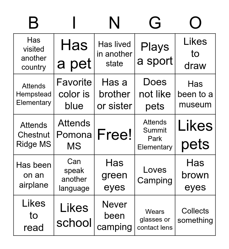 This bingo card has a free space and 24 words: Likes to read, Can speak another language, Has a brother or sister, Wears glasses or contact lens, Likes to draw, Has visited another country, Has a pet, Has lived in another state, Attends Summit Park Elementary, Likes pets, Attends Chestnut Ridge MS, Favorite color is blue, Loves Camping, Has brown eyes, Attends Hempstead Elementary, Likes school, Never been camping, Plays a sport, Has been to a museum, Has been on an airplane, Attends Pomona MS, Has green eyes, Does not like pets and Collects something.
