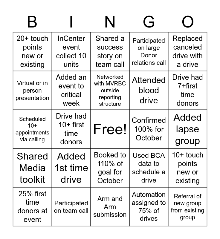 This bingo card has a free space and 24 words: Added 1st time drive, Participated on team call, Networked with MVRBC outside reporting structure, 25% first time donors at event, Replaced canceled drive with a drive, 20+ touch points new or existing, Virtual or in person presentation, InCenter event collect 10 units, Confirmed 100% for October, Booked to 110% of goal for October, Attended blood drive, Scheduled 10+ appointments via calling, Used BCA data to schedule a drive, 10+ touch points new or existing, Added an event to critical week, Automation assigned to 75% of drives, Added lapse group, Shared a success story on team call, Drive had 7+first time donors, Drive had 10+ first time donors, Referral of new group from existing group, Shared Media toolkit, Participated on large Donor relations call and Arm and Arm submission.
