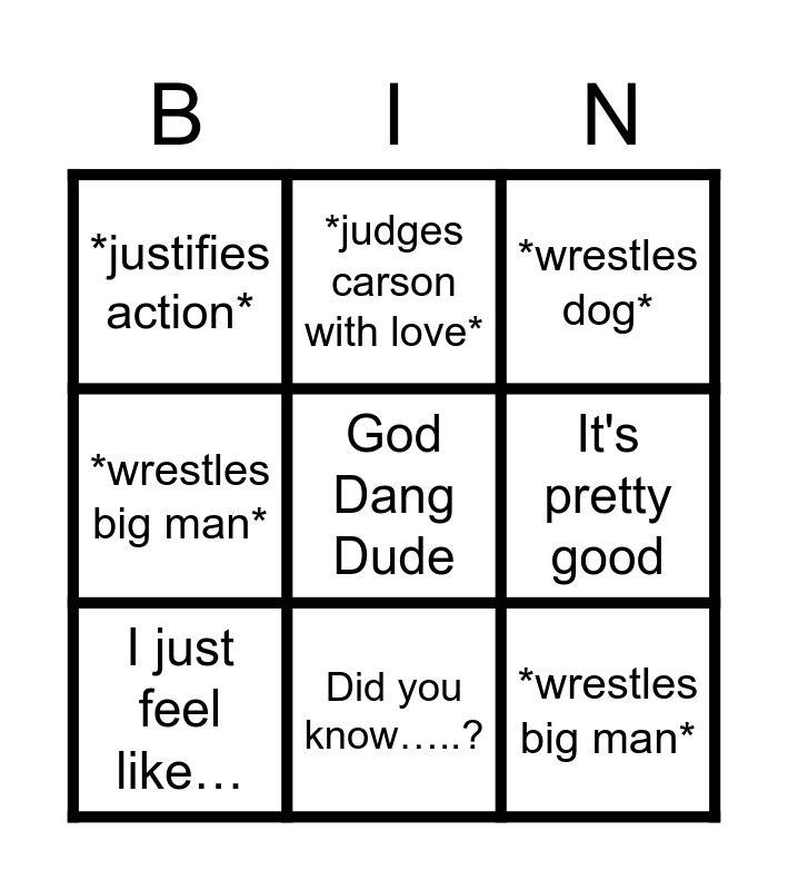 ⚠ This card has duplicate items: *judges carson with love* (2), *phone call* yello? (2), *wrestles dog* (4), *wrestles big man* (4), I just feel like… (5), *does weird hand things* (2)