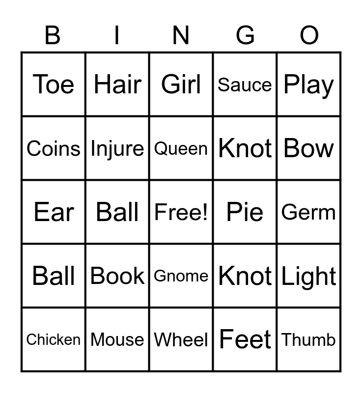 This bingo card has a free space and 24 words: Book, Mouse, Queen, Chicken, Play, Toe, Coins, Hair, Pie, Gnome, Knot, Ear, Knot, Light, Injure, Feet, Germ, Girl, Bow, Ball, Thumb, Ball, Sauce and Wheel.