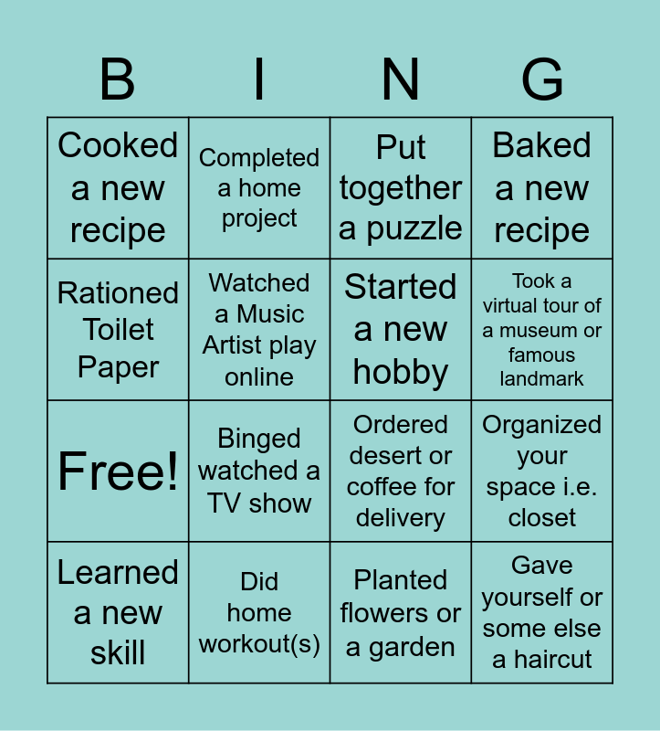 This bingo card has 20 words: Organized your space i.e. closet, Joined a Virtual Sing-a-long, Put together a puzzle, Wore PJs all day, Learned a new skill, Rationed Toilet Paper, Did home workout(s), Cooked a new recipe, Free!, Completed a home project, Binged watched a TV show, Ordered desert or coffee for delivery, Watched a Music Artist play online, Gave yourself or some else a haircut, Started a new hobby, Re-read your favourite book series, Took a virtual tour of a museum or famous landmark, Baked a new recipe, Planted flowers or a garden and Restarted a personal goal.