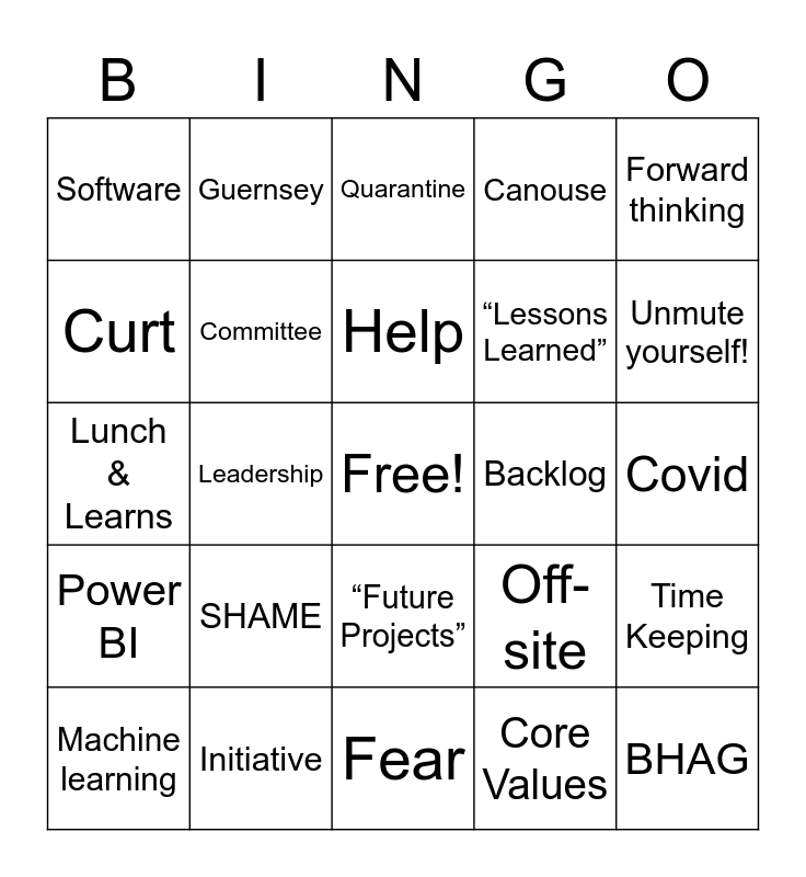 This bingo card has a free space and 25 words: SHAME, Fear, Help, Machine learning, Forward thinking, Software, Curt, Guernsey, Backlog, “Future Projects”, “Lessons Learned”, Lunch & Learns, Off-site, Time Keeping, Committee, Teams, Covid, Quarantine, Unmute yourself!, Leadership, BHAG, Initiative, Power BI, Canouse and Core Values.