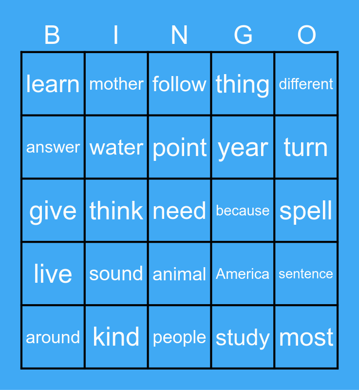 This bingo card has 1 images and 41 words: over, point, found, sound, study, sentence, need, world, follow, animal, spell, turn, think, different, house, America, through, give, picture, mother, answer, great, most, learn, should, three, year, home, before, know, same, live, water, people, again, around, kind, because, another, letters and thing.