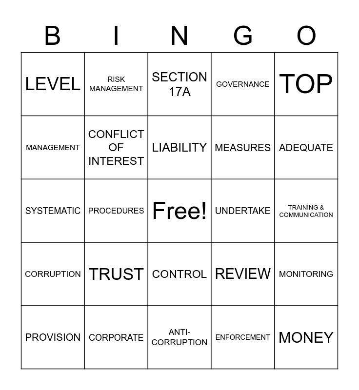 This bingo card has a free space and 24 words: TRUST, CORPORATE, LIABILITY, PROVISION, TOP, LEVEL, MANAGEMENT, RISK MANAGEMENT, UNDERTAKE, CONTROL, MEASURES, SYSTEMATIC, REVIEW, MONITORING, CONFLICT OF INTEREST, ENFORCEMENT, TRAINING & COMMUNICATION, SECTION 17A, ADEQUATE, PROCEDURES, MONEY, CORRUPTION, GOVERNANCE and ANTI-CORRUPTION.