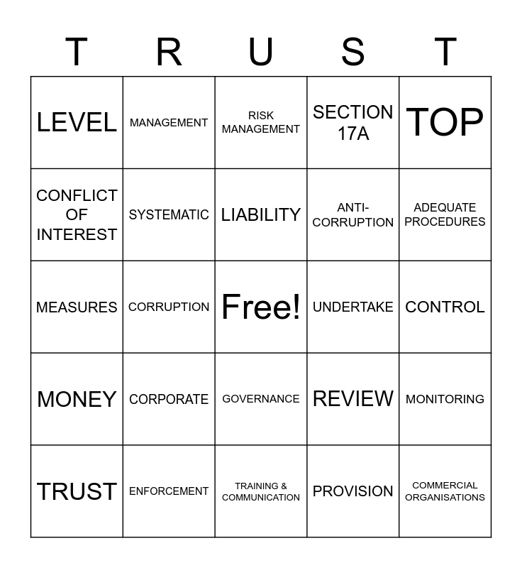 This bingo card has a free space and 24 words: TRUST, CORPORATE, LIABILITY, PROVISION, TOP, LEVEL, MANAGEMENT, RISK MANAGEMENT, UNDERTAKE, CONTROL, MEASURES, SYSTEMATIC, REVIEW, MONITORING, CONFLICT OF INTEREST, ENFORCEMENT, TRAINING & COMMUNICATION, SECTION 17A, ADEQUATE PROCEDURES, MONEY, CORRUPTION, GOVERNANCE, ANTI-CORRUPTION and COMMERCIAL ORGANISATIONS.