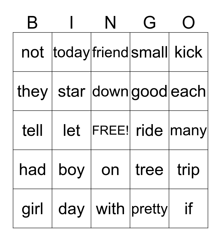 This bingo card has a free space and 24 words: boy, day, down, girl, kick, not, they, today, ride, on, good, tell, tree, trip, star, pretty, many, friend, each, let, if, had, small and with.