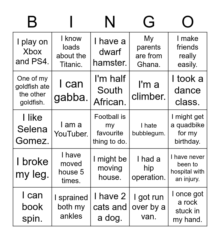 This bingo card has 30 words: I sprained both my ankles, My grandparents live in America., I am a YouTuber., I have a little brother., I play on Xbox and PS4., I have a dwarf hamster., I can gabba., I might be moving house., I hate bubblegum., I have 2 cats and a dog., I might get a quadbike for my birthday., Football is my favourite thing to do., I got run over by a van., I once got a rock stuck in my hand., I took a dance class., I went to the Harry Potter Studios., I had a hip operation., I broke my leg., I have moved house 5 times., I make friends really easily., I like Selena Gomez., I won a trophy and threw up in it., I know loads about the Titanic., I'm a climber., One of my goldfish ate the other goldfish., My parents are from Ghana., I have never been to hospital with an injury., I can book spin., I'm half South African. and I used to live in my attic..