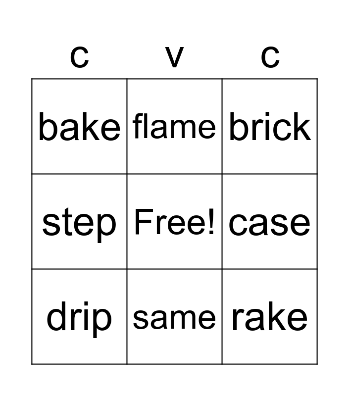 This bingo card has a free space and 23 words: snake, cake, same, brave, rake, bake, case, flame, shade, sale, mate, ape, shape, stem, from, plan, brick, flag, drip, block, step, prod and crip.