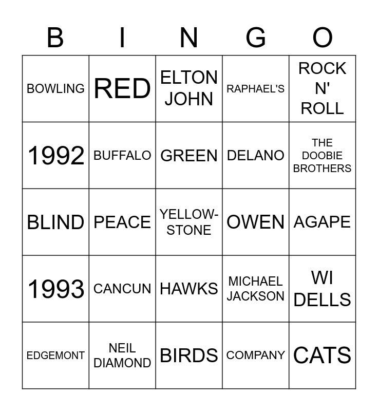 This bingo card has 1 images and 27 words: WI DELLS, PICKLE-BALL, DELANO, COMPANY, 1992, ELTON JOHN, RED, 1993, OWEN, EDGEMONT, BLIND, RAPHAEL'S, NEIL DIAMOND, BIRDS, THE DOOBIE BROTHERS, PIANO, CANCUN, BUFFALO, GREEN, HAWKS, BOWLING, CATS, YELLOW-STONE, PEACE, AGAPE, MICHAEL JACKSON and ROCK N' ROLL.