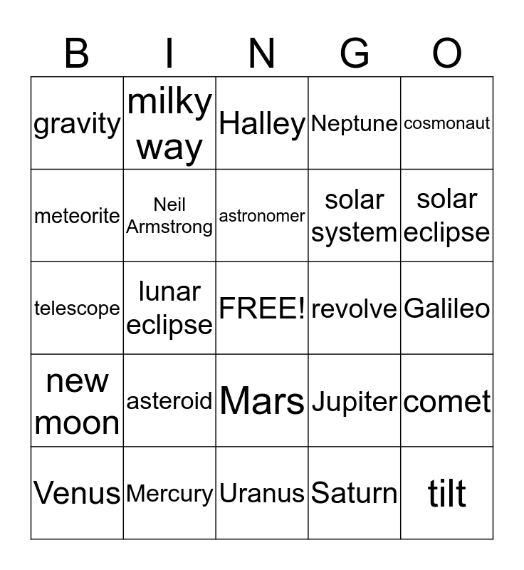 This bingo card has a free space and 24 words: asteroid, Mercury, astronomer, Venus, cosmonaut, gravity, meteorite, milky way, revolve, Mars, solar system, telescope, Jupiter, comet, Neil Armstrong, Saturn, Galileo, Halley, solar eclipse, lunar eclipse, tilt, new moon, Neptune and Uranus.