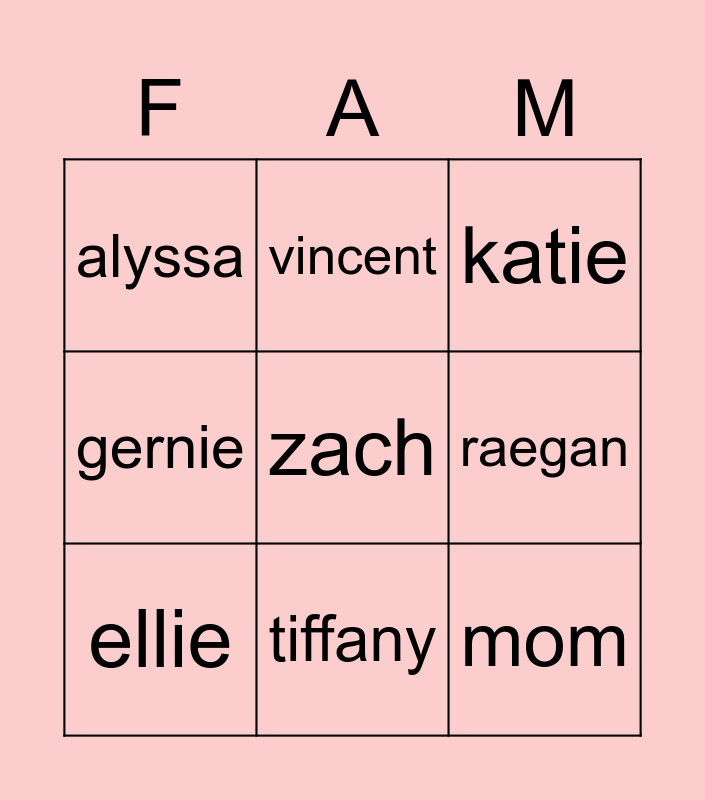 This bingo card has 12 words: dad, mom, zach, raegan, vincent, katie, tiffany, charlie, alyssa, gernie, ellie and elliott.