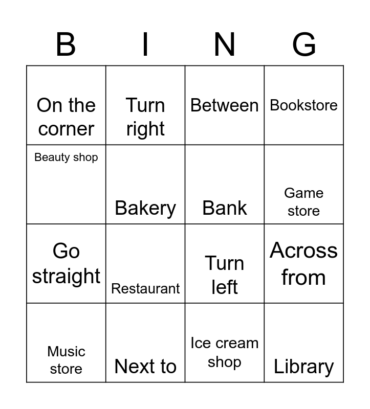 This bingo card has 16 words: Next to, Across from, Between, On the corner, Go straight, Turn right, Turn left, Ice cream shop, Beauty shop, Bakery, Music store, Bookstore, Restaurant, Game store, Bank and Library.