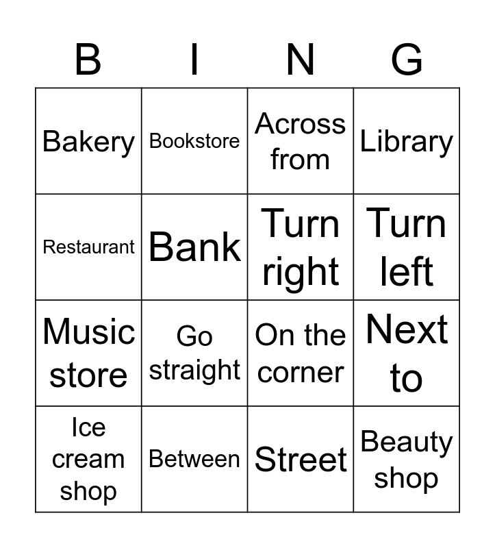 This bingo card has 16 words: Between, Next to, Across from, Bakery, Music store, Bookstore, On the corner, Street, Restaurant, Bank, Ice cream shop, Library, Go straight, Turn left, Turn right and Beauty shop.