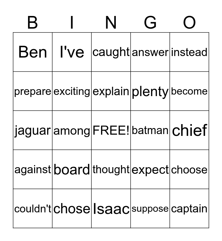 This bingo card has a free space and 36 words: afternoon, doesn't, during, exciting, expect, against, explain, important, instead, iron, among, answer, asleep, batman, become, Ben, below, board, captain, caught, chief, choose, chose, couldn't, Isaac, I've, jaguar, minecraft, plenty, prepare, reef, suddenly, suppose, thought, through and wrong.