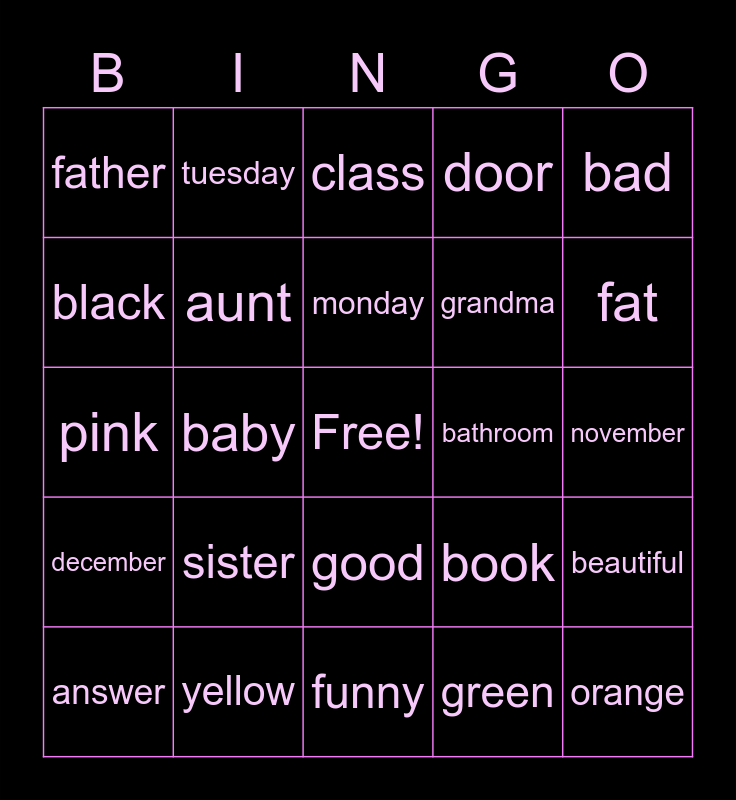 This bingo card has a free space and 24 words: sister, yellow, monday, answer, bad, father, black, tuesday, bathroom, good, grandma, pink, book, beautiful, aunt, green, november, class, fat, baby, orange, december, door and funny.