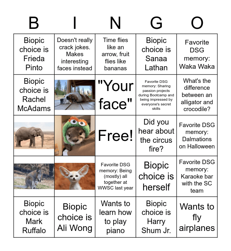 This bingo card has 7 images, a free space and 32 words: Wants to learn woodworking, Favorite DSG memory: Secret Santa :), Biopic choice is Kate Bosworth, Biopic choice is Mark Ruffalo, Favorite DSG memory: Being (mostly) all together at WWSC last year, "Your face", What did the buffalo say when his son left?, Favorite DSG memory: Waka Waka, Biopic choice is Sanaa Lathan, Wants to fly airplanes, Favorite DSG memory: Dalmations on Halloween, Did you hear about the circus fire?, Favorite DSG memory: Board-game Olympics, Biopic choice is Frieda Pinto, Biopic choice is herself, Biopic choice is Rachel McAdams, Wants to learn how to play piano, Favorite DSG memory: Sharing passion projects during Bootcamp and being impressed by everyone's secret skills, What's the difference between an alligator and crocodile?, Wants to play an instrument because they want to crowd please at a party, Wants to become VERY good at any instrument, preferably the sax, Wants to speak multiple languages, Wants to learn bluewater sailing, Wants to hunt and live off of the land, Doesn't really crack jokes. Makes interesting faces instead, Doesn't even attempt to make jokes, General sarcasm, Time flies like an arrow, fruit flies like bananas, Biopic choice is Ali Wong, Biopic choice is Harry Shum Jr., Favorite DSG memory: Food vulturing and Favorite DSG memory: Karaoke bar with the SC team.