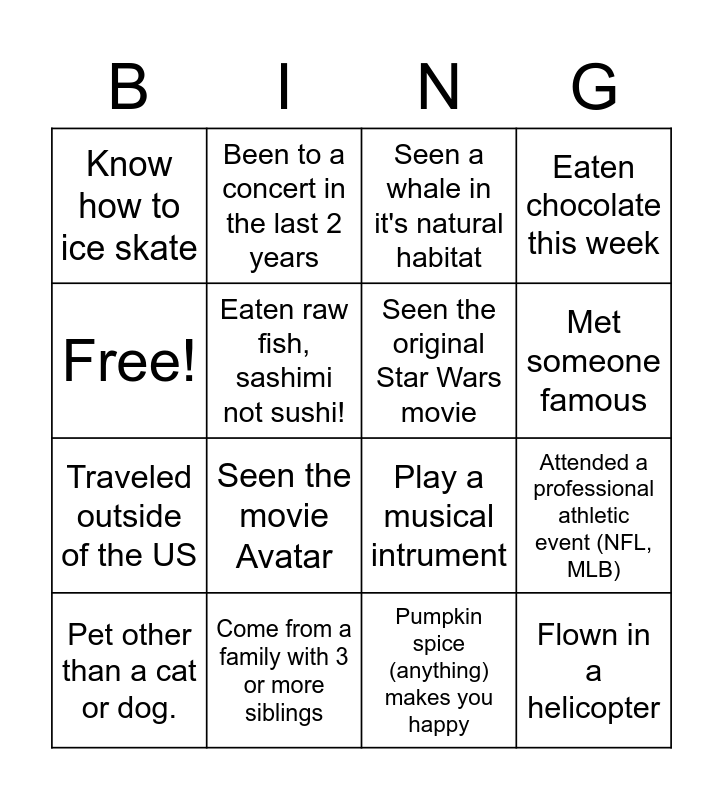 This bingo card has 17 words: Pet other than a cat or dog., Come from a family with 3 or more siblings, Seen a whale in it's natural habitat, Eaten chocolate this week, Traveled outside of the US, Eaten raw fish, sashimi not sushi!, Play a musical intrument, Met someone famous, Free!, Seen the movie Avatar, Pumpkin spice (anything) makes you happy, Attended a professional athletic event (NFL, MLB), Know how to ice skate, Been to a concert in the last 2 years, Seen the original Star Wars movie, Flown in a helicopter and Have a pet other than a cat or dog.
