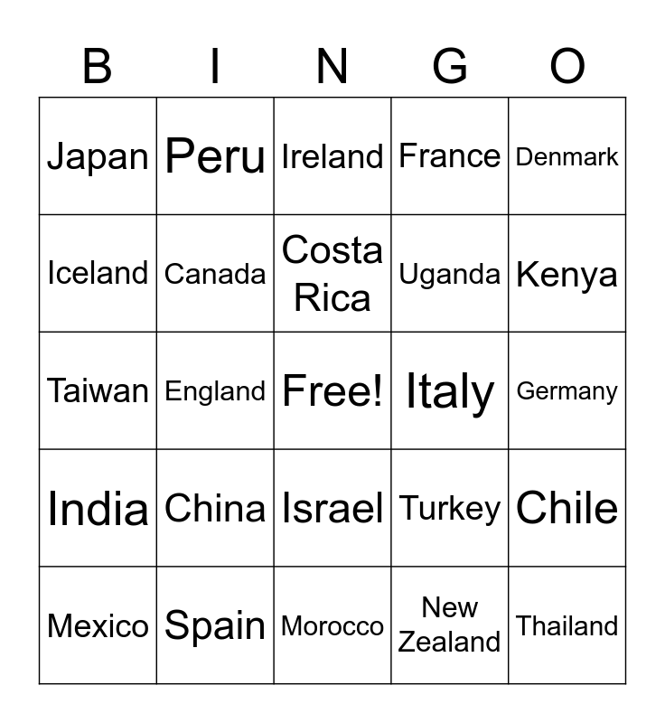 This bingo card has 37 words: Argentina, Australia, Brazil, Canada, Chile, China, Costa Rica, Cuba, Denmark, Egypt, England, France, Free!, Germany, Iceland, India, Indonesia, Ireland, Israel, Italy, Japan, Kenya, Mexico, Morocco, Nepal, New Zealand, Peru, Puerto Rico, Russia, South Africa, South Korea, Spain, Taiwan, Thailand, Turkey, Uganda and Vietnam.