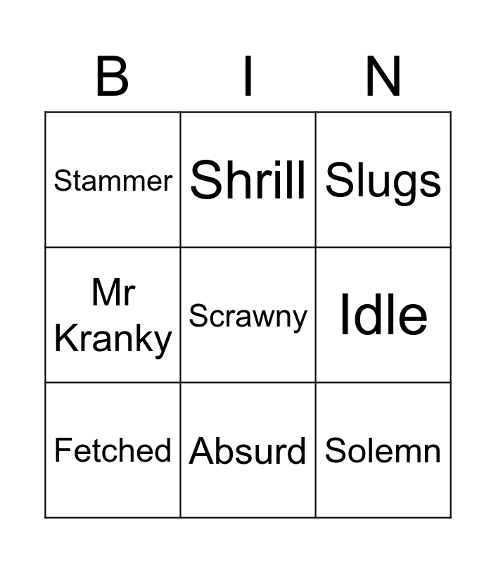 This bingo card has a free space and 23 words: George, Solemn, Absurd, Grandma, Solemn, Stammer, Idle, Shrill, Medicine, Brown paint, Shaving foam, Tea, Grumpy, Bossy, Tall, Insects, Slugs, Mischief, Fetched, Lazy, Mr Kranky, Crane and Nuisance.